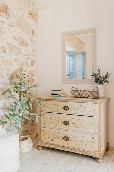 Two masterbedrooms with kingsize bed, original stone wall and a bathroom aside.